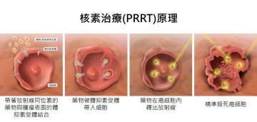 神經內分泌瘤表面常具有豐富的體抑素受體,核素治療(PRRT) 就是利用體抑素受體結合藥物進到癌細胞裡,再釋出放射線殺死癌細胞。這樣精準的腫瘤治療方式,可降低治療副作用,提升病人的預後和生活品質。