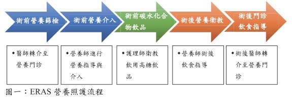 土城醫院目前執行 ERAS 營養照護的手術別為胃癌及大腸癌手術,為給予病人全面性的營養照護,照護流程需要各專科的配合(圖一)。