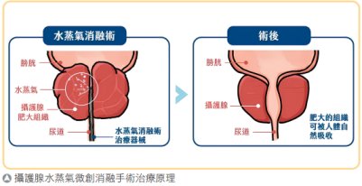 攝護腺水蒸氣微創消融手術的治療原理,是利用細針將水蒸氣注入攝護腺,使攝護腺組織萎縮,最終被人體自然吸收。特點是不破壞尿道結構,也無永久植入物,能真正縮小攝護腺體積。手術過程非常快速,安全性很高,病人可以選擇當天門診手術,無須住院,當天就可以回家,病人也都有良好的療效,適合有排尿症狀、希望能改善生活品質的攝護腺肥大患者,或是仍在服藥與手術之間觀望的病人,可以考慮以微創的方式,快速而安全的解決攝護腺的難題。