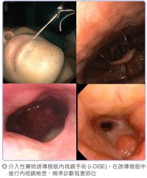 精準診斷的突破:介入性藥物誘導睡眠內視鏡(i-DISE) 為提升診斷準確度,本科在李宜展醫師與筆者的合作下,近5 年來針對睡眠呼吸中止症病人導入「介入性藥物誘導睡眠內視鏡手術」(interventional Drug-Induced Sleep Endoscopy, i-DISE)。手術透過靜脈注射藥物與同步麻醉深度監控,使患者進入類似自然睡眠的狀態,藉此使用內視鏡觀察病人打鼾時的上呼吸道阻塞變化,並同時藉由介入軟顎、舌根拉提之後阻塞型態的改變等預測手術成效。藉由 i-DISE,病人也得以更加了解自己的呼吸道阻塞,認識手術治療的選擇以及可預期的成效,更符合「精準醫療」以及「醫病決策共享」的新趨勢。