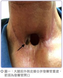 使用大腿前外側皮瓣合併發聲管重建的病人,在發聲時不需依賴外接輔具,而是只需以拇指輕壓氣管造口,便可將氣流導引進入發聲管。當空氣通過發聲管時,會引發管壁震動,產生聲音(圖一),再經由口腔、舌頭與牙齒等發音構造進行調音,最終轉化為清晰可懂的語音。這項創新的發聲方式,不但讓病人能自然地開口說話,也大幅提升了日常溝通的便利性與自主性。術後的發聲復健計畫通常在手術後約3 週開始啟動,每位患者會接受約 6 至 12 次的復健療程,整體療程長達 3 個月至 1 年不等。治療過程中,語言治療師會協助病人練習正確的發聲技巧,並鼓勵持續自主練習,促進氣流順利通過發聲管,以降低發聲管狹窄或阻塞的風險。在復健初期,部分患者可能會出現聲音緊繃或沙啞的情況,但隨著發聲技巧的熟練度提升,以及管腔內術後腫脹逐漸消退,這些不適通常會明顯改善,聲音表現也會更為穩定流暢。