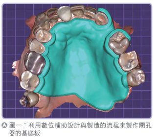 閉孔器的製作 製作的關鍵處在於如何將相通的孔洞輪廓精準地印製出來。孔洞邊緣通常是具有彈性的軟組織,需具有黏彈性(viscoelasticity)和稠度的印模材料才能加壓記錄出軟組織正確的型態,進而製作出可以密貼封閉的閉孔器。在傳統製程裡面,需要經過初次印模與二次精確印模取得相通缺損處的精準邊緣、金屬支架製作、咬合紀錄、排牙試戴、最後壓製完成。流程不僅繁瑣費時,在印模過程更會造成印模材料掉落缺損處的風險及過程的不適感。有了數位技術的引入,透過電腦輔助設計與電腦輔助製造(CAD/CAM)技術的應用,可以大幅精簡閉孔器製作過程,突破臨床治療的極限。