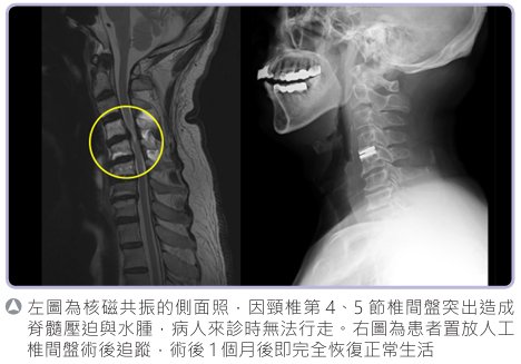 隨著 3C產品的普及與現代社會工作型態的改變,頸椎椎間盤退化性病變導致頸部疼痛,或有神經壓迫症狀需要開刀手術治療的病人,有越來越年輕的趨勢。當椎間盤過度退化,既無法提供穩定性又無法再生時,傳統手術會將其移除,再植入支架 (cage)與骨基質以協助融合,重建椎體間的穩定性,這是傳統的椎體間融合固定手術。這樣的手術方式雖然能改善臨床症狀,術後兩年的病人滿意度也高達 8∼9成,可是因為手術將該節融合後,會增加上下鄰近椎間盤的負擔,反而可能會加速此兩鄰近關節的退化,造成新的骨刺增生或椎間盤突出,依照過往文獻,這樣的機率在手術後每年會以 3%的比例逐漸遞增。為了降低這樣的併發症,頸椎人工椎間盤置換手術 (Artificial Disc Replacement)因此誕生。